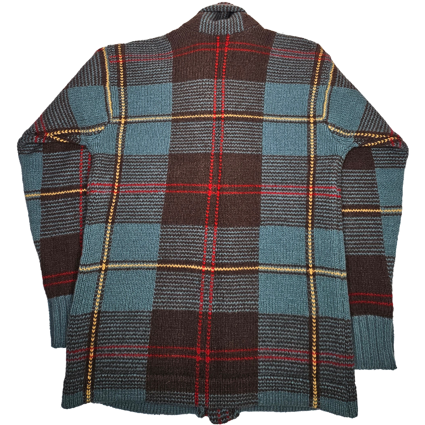 NOTE: THIS ITEM IS A KNIT CARDIGAN AND IT MAY HAVE SMALL IMPERFECTIONS. THIS ITEM IS MISSING (2) BUTTONS AND THE LATCH BEHIND THE SHAWL COLLAR (PICTURED).