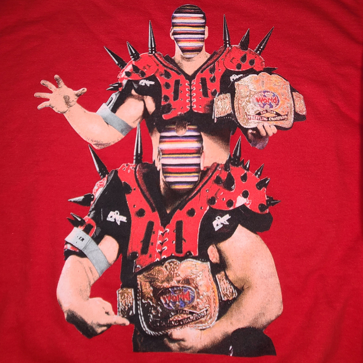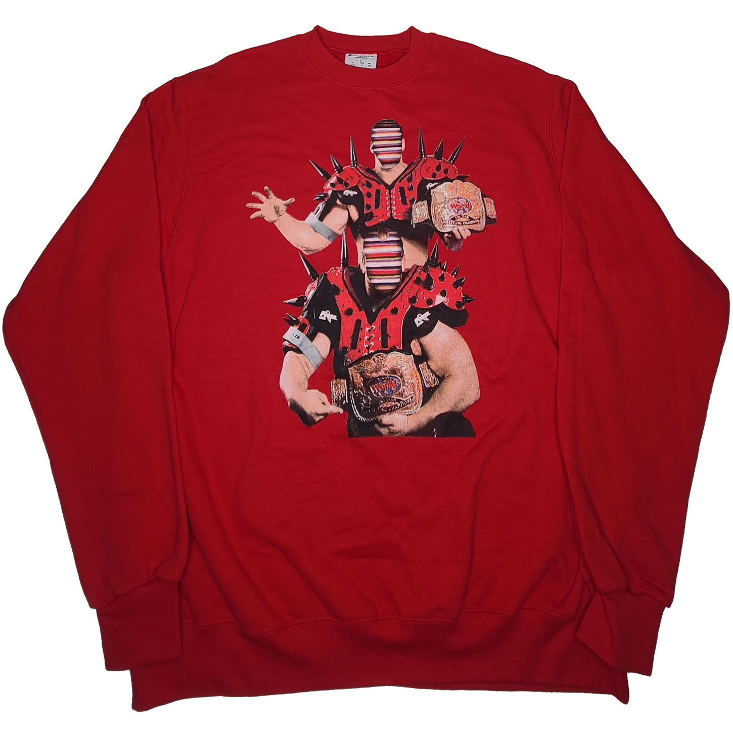 NOTE: THIS ITEM IS IN SLIGHTLY USED CONDITION. THE WRESTLERS FEATURED ON THE CREWNECK ARE THE ROAD WARRIORS AKA LEGION OF DOOM.