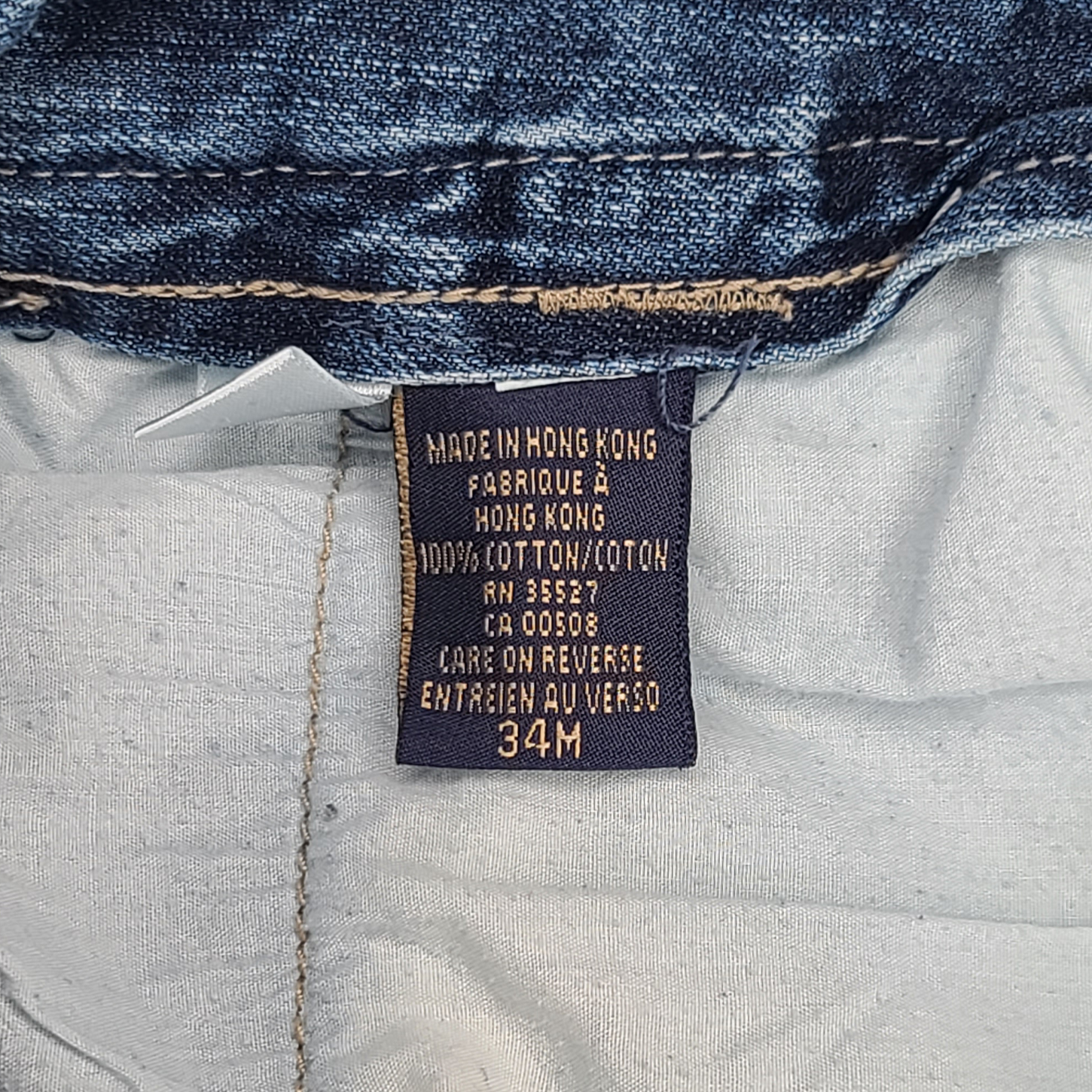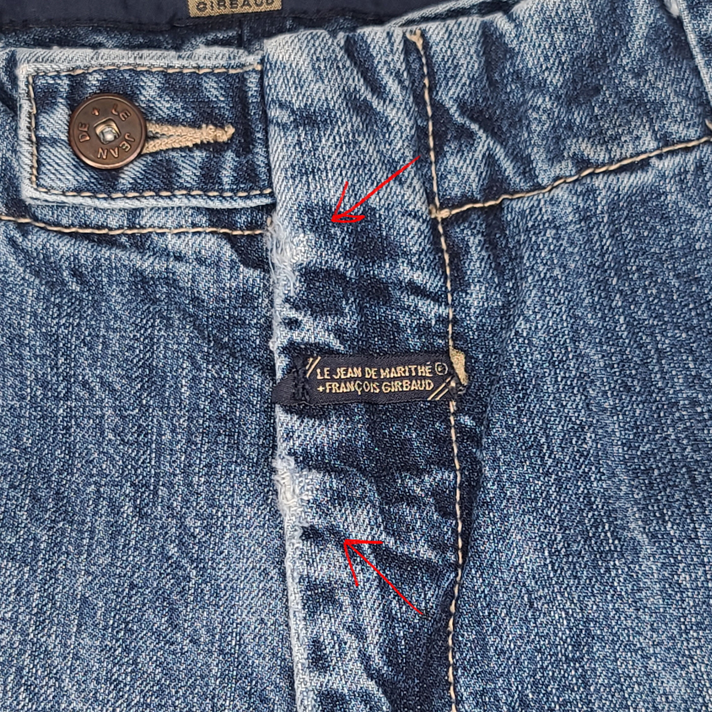 NOTE: THIS ITEM IS HAS LIGHT DISTRESS ON THE HEM HEELS (PICTURED), FLY AND BACK POCKET (PICTURED).